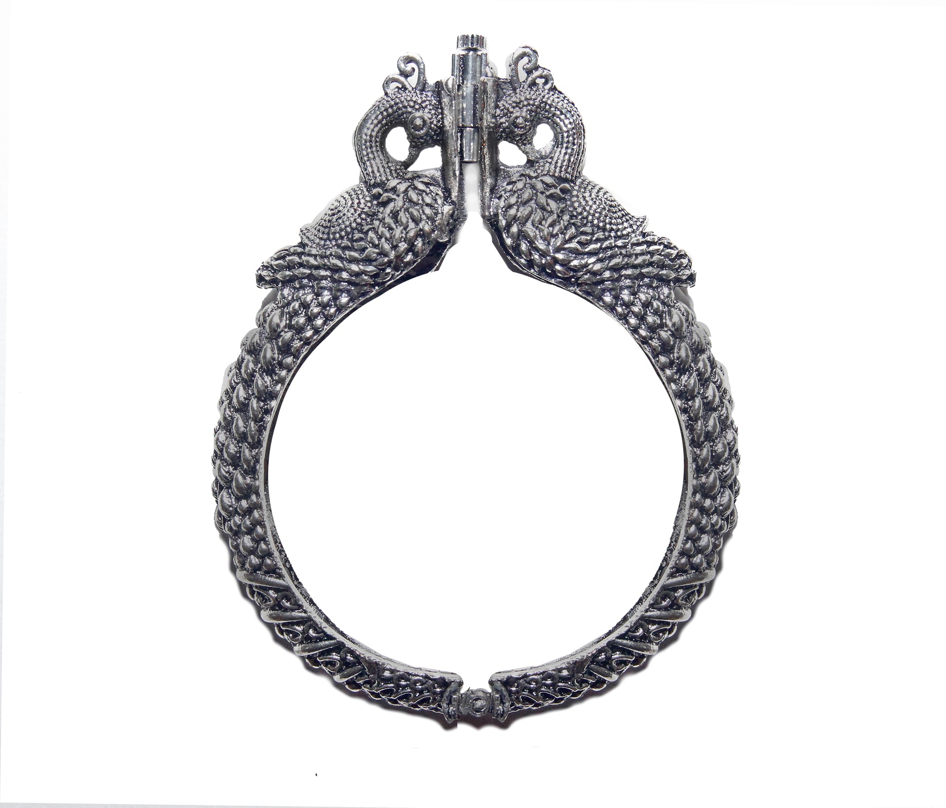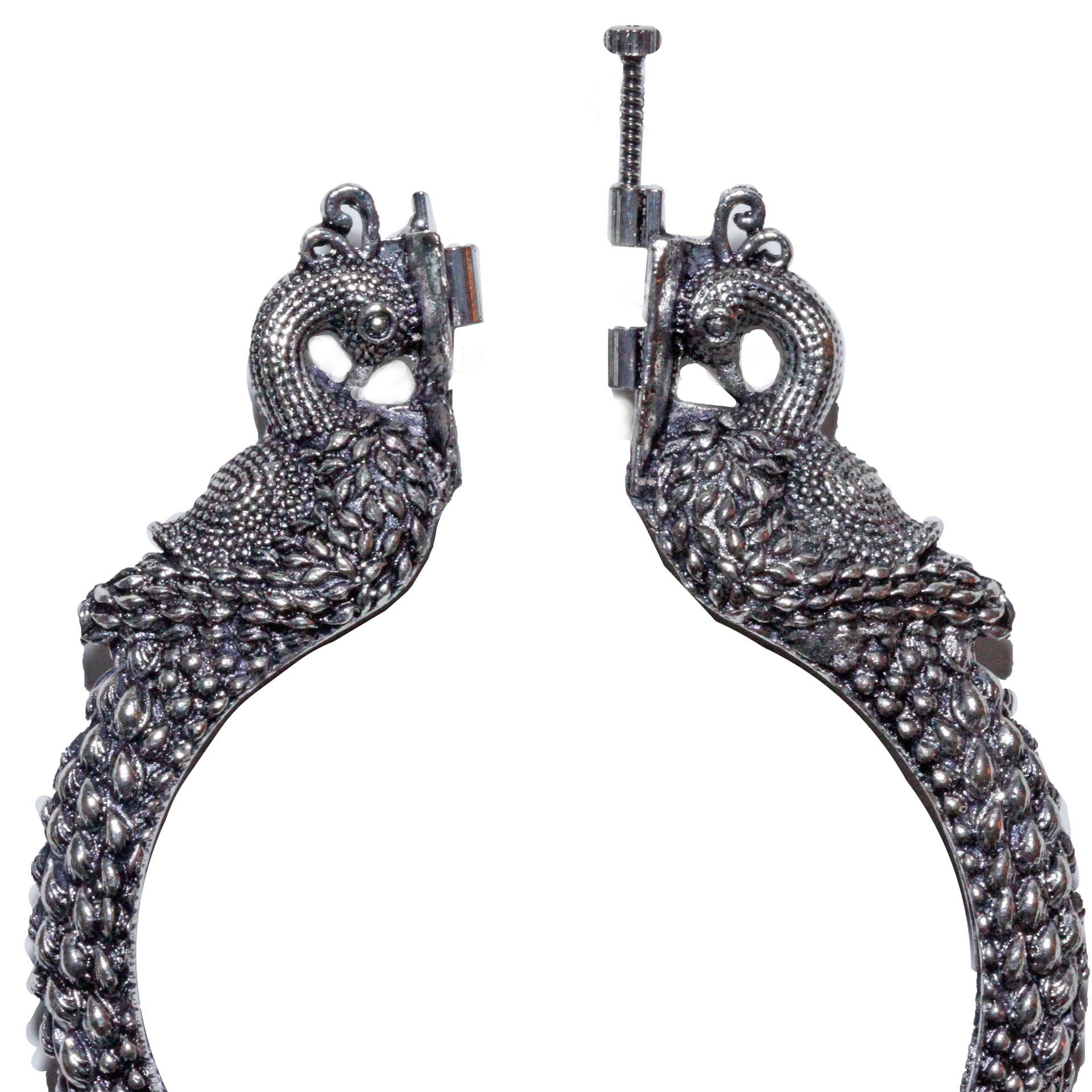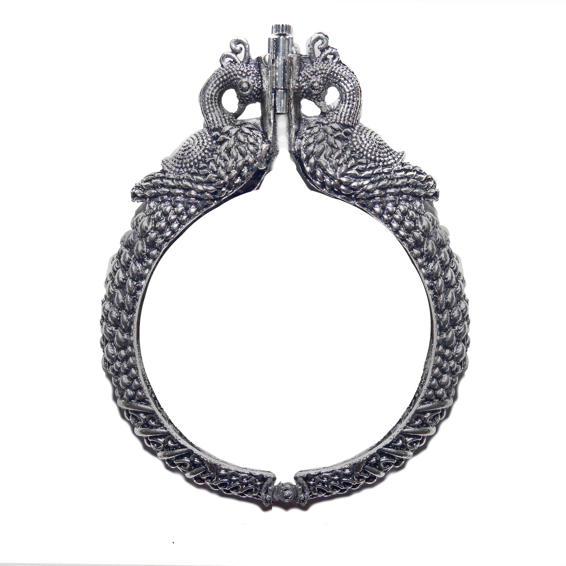 An oxidized silver kada featuring twin peacocks facing each other — a symbol of grace and strength. Hand-crafted with intricate detailing, it embodies heritage artistry reimagined for modern wear.
