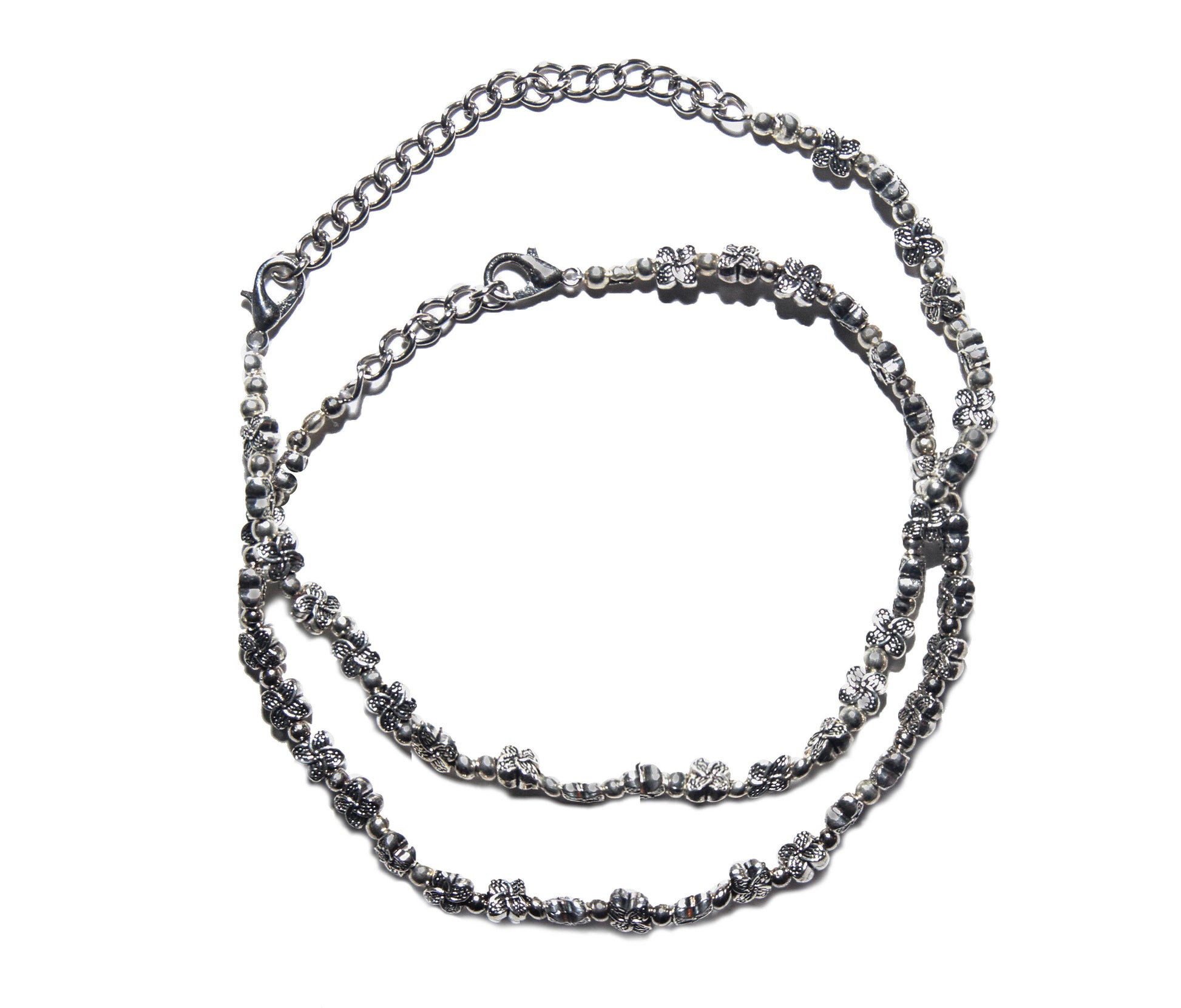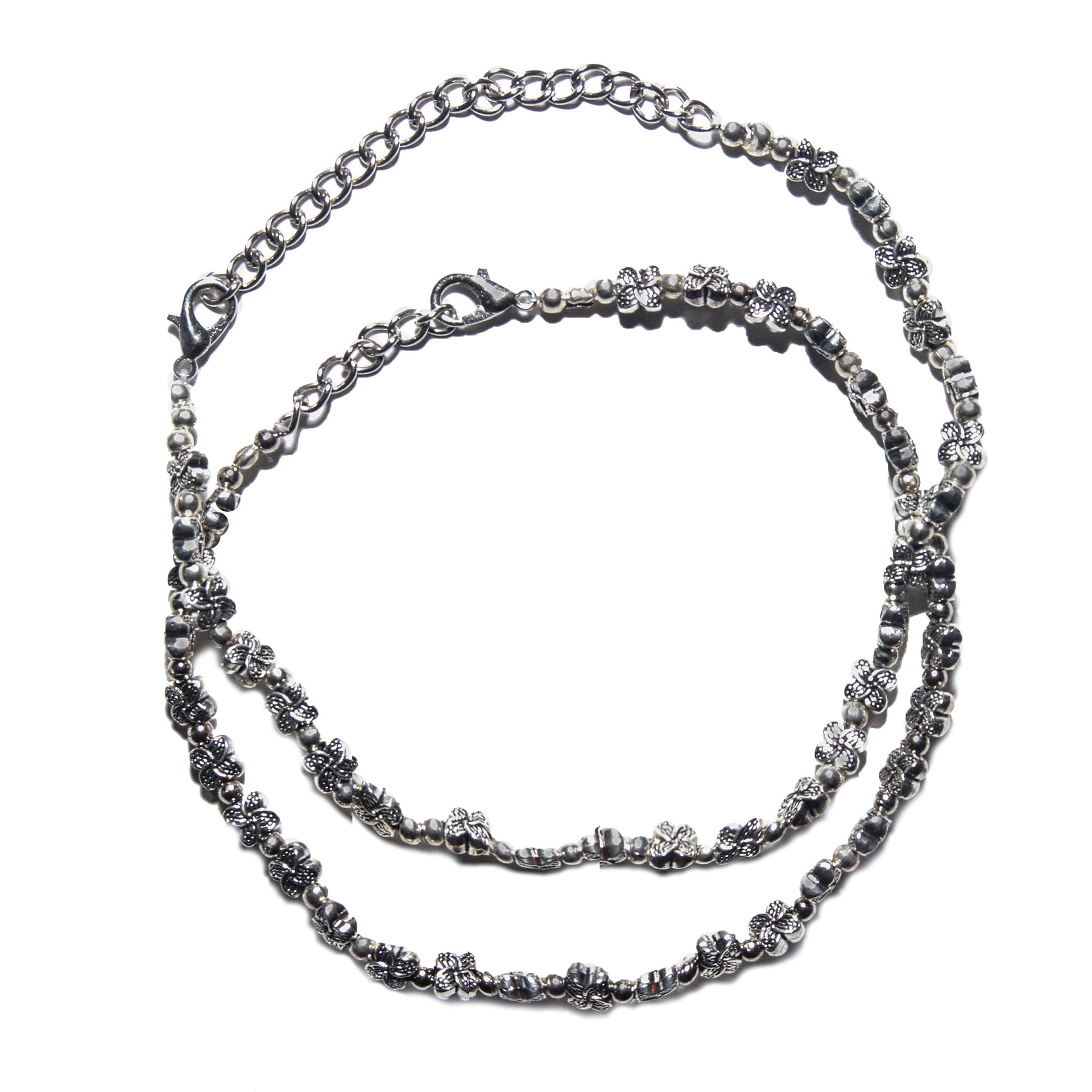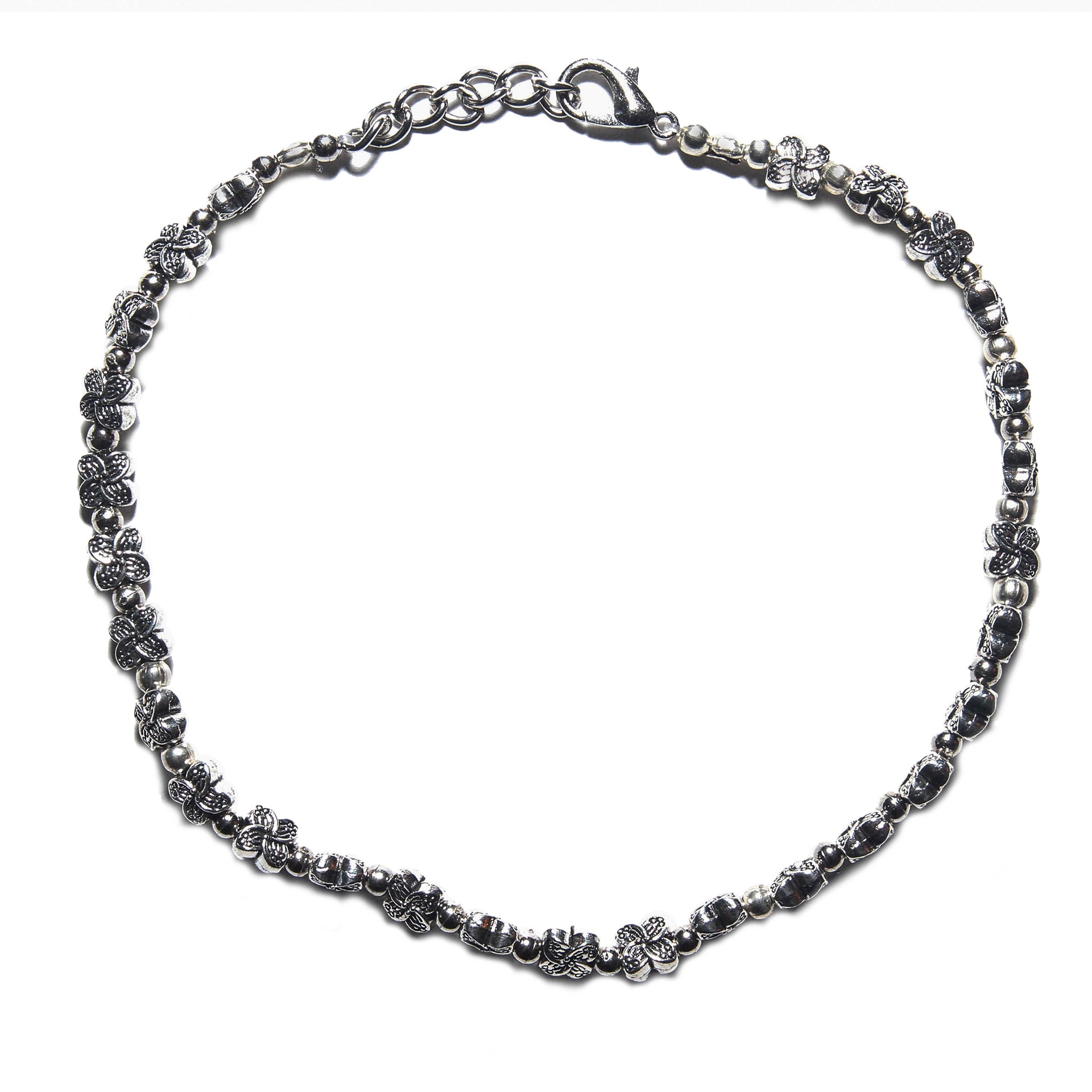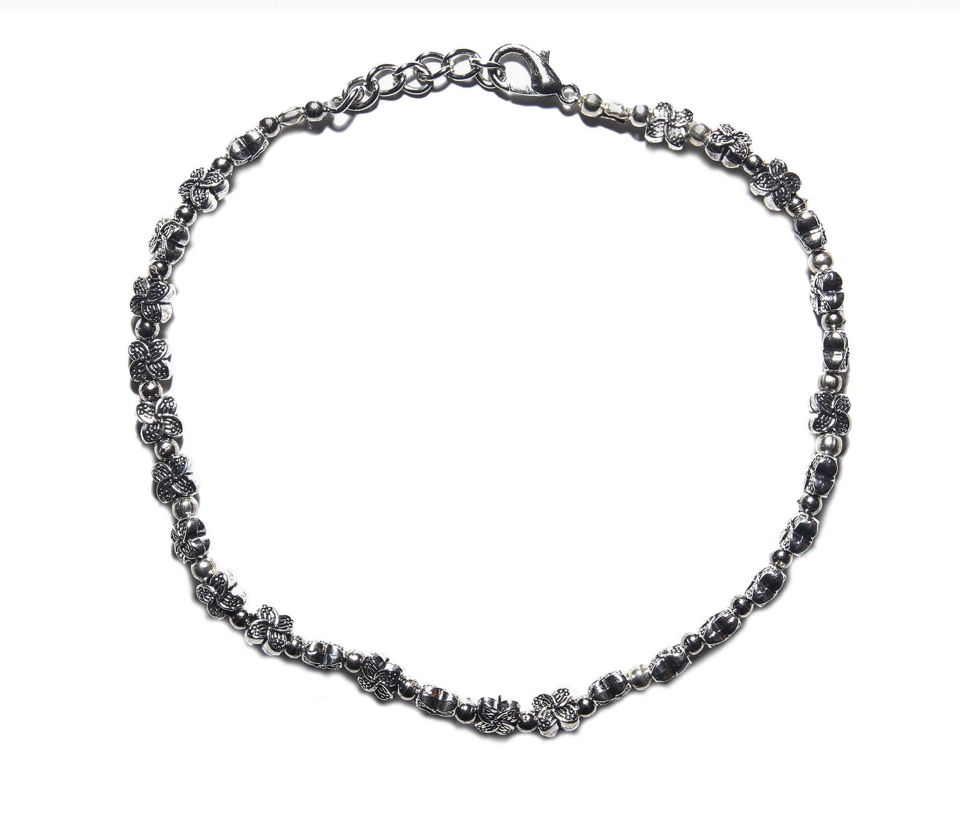 Delicate oxidized silver anklet featuring tiny floral-inspired beads linked in a graceful chain. Lightweight and timeless — perfect for adding subtle charm to your everyday or festive look.