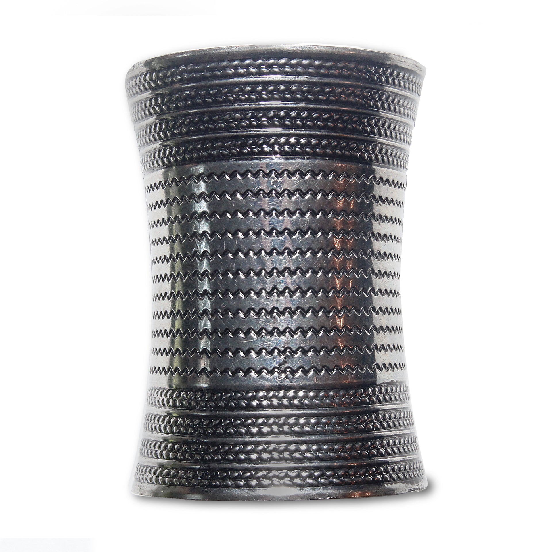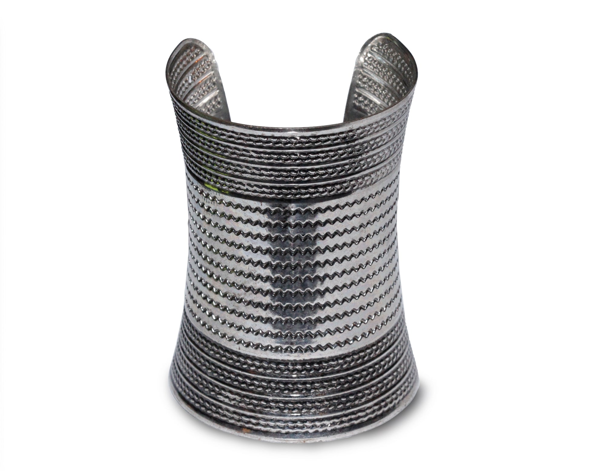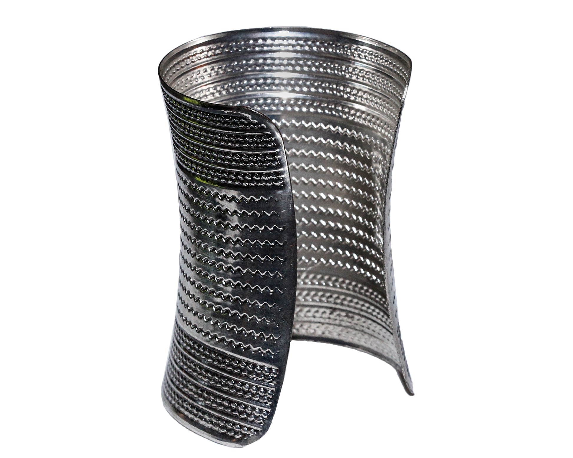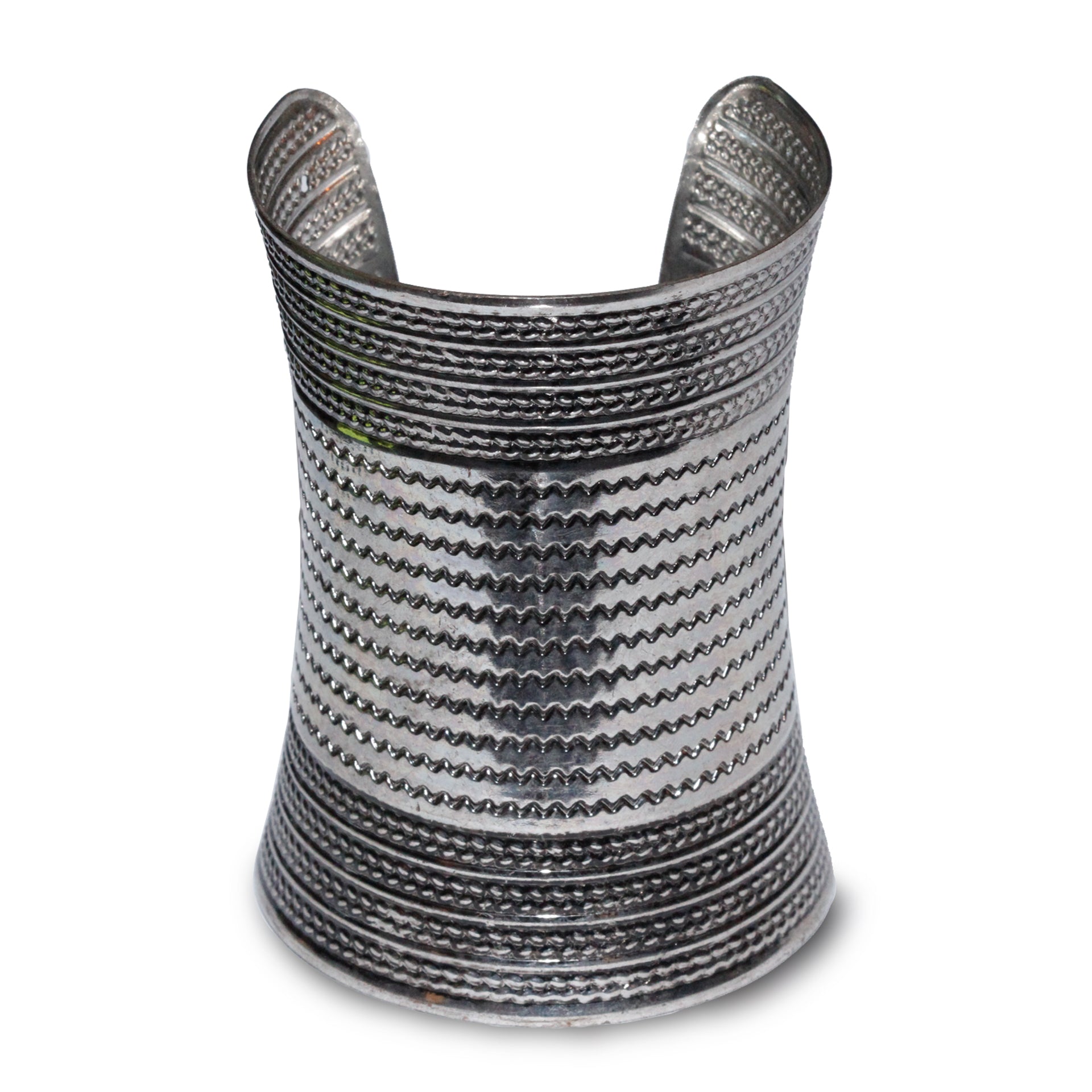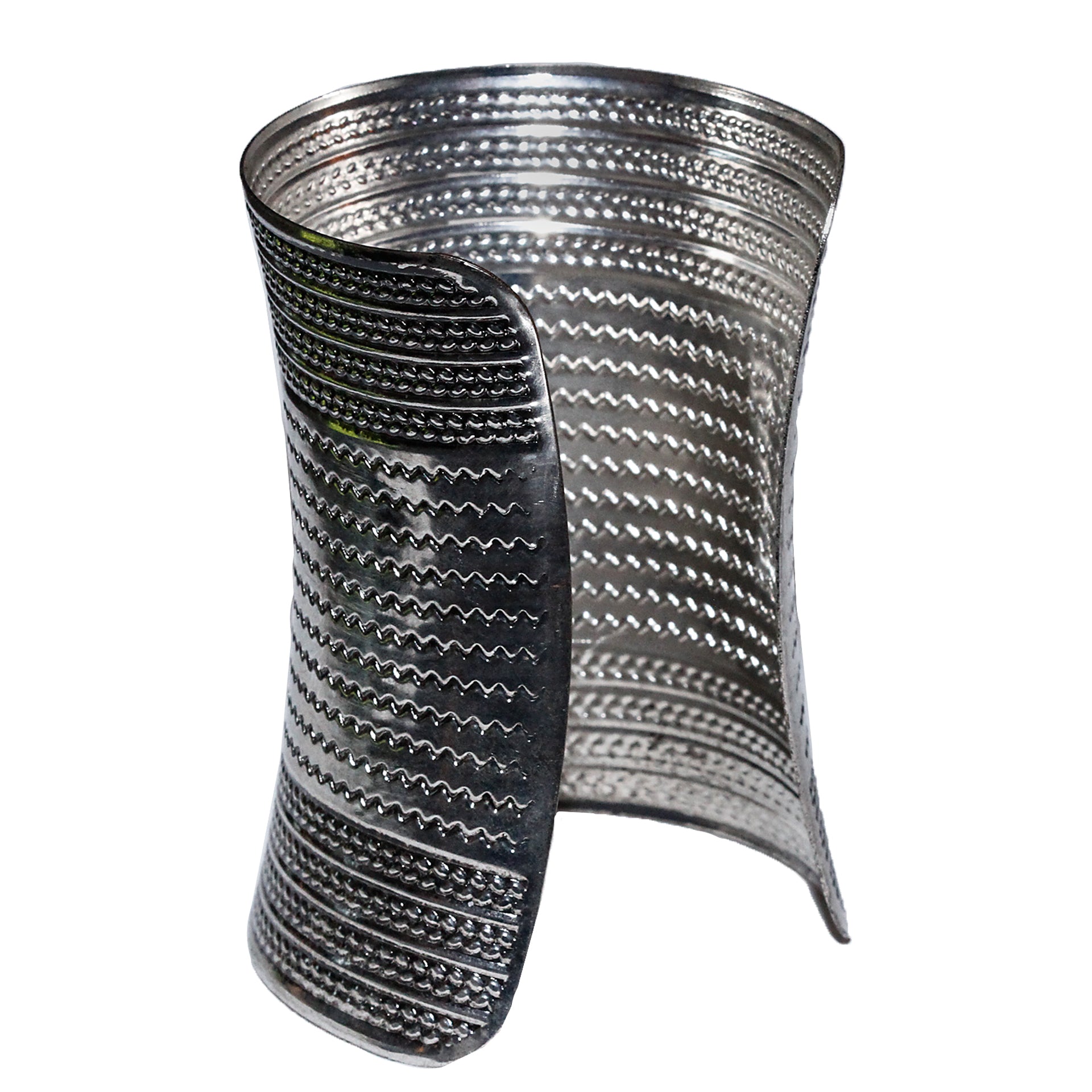 An intricately engraved oxidized silver cuff with a flowing vine pattern. Elegant and artistic, it adds a touch of vintage sophistication to any ensemble.