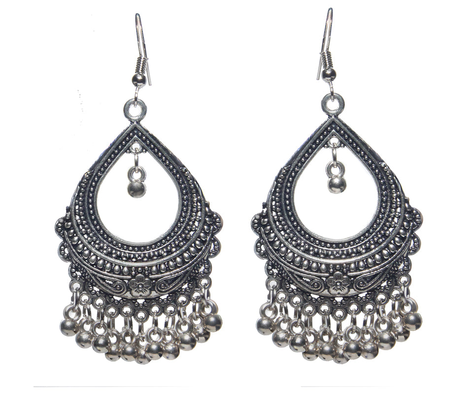 Handcrafted antique silver earrings inspired by South Asian heritage, featuring intricate detailing and delicate dangling accents. A timeless, versatile design that elevates both festive and contemporary looks.
