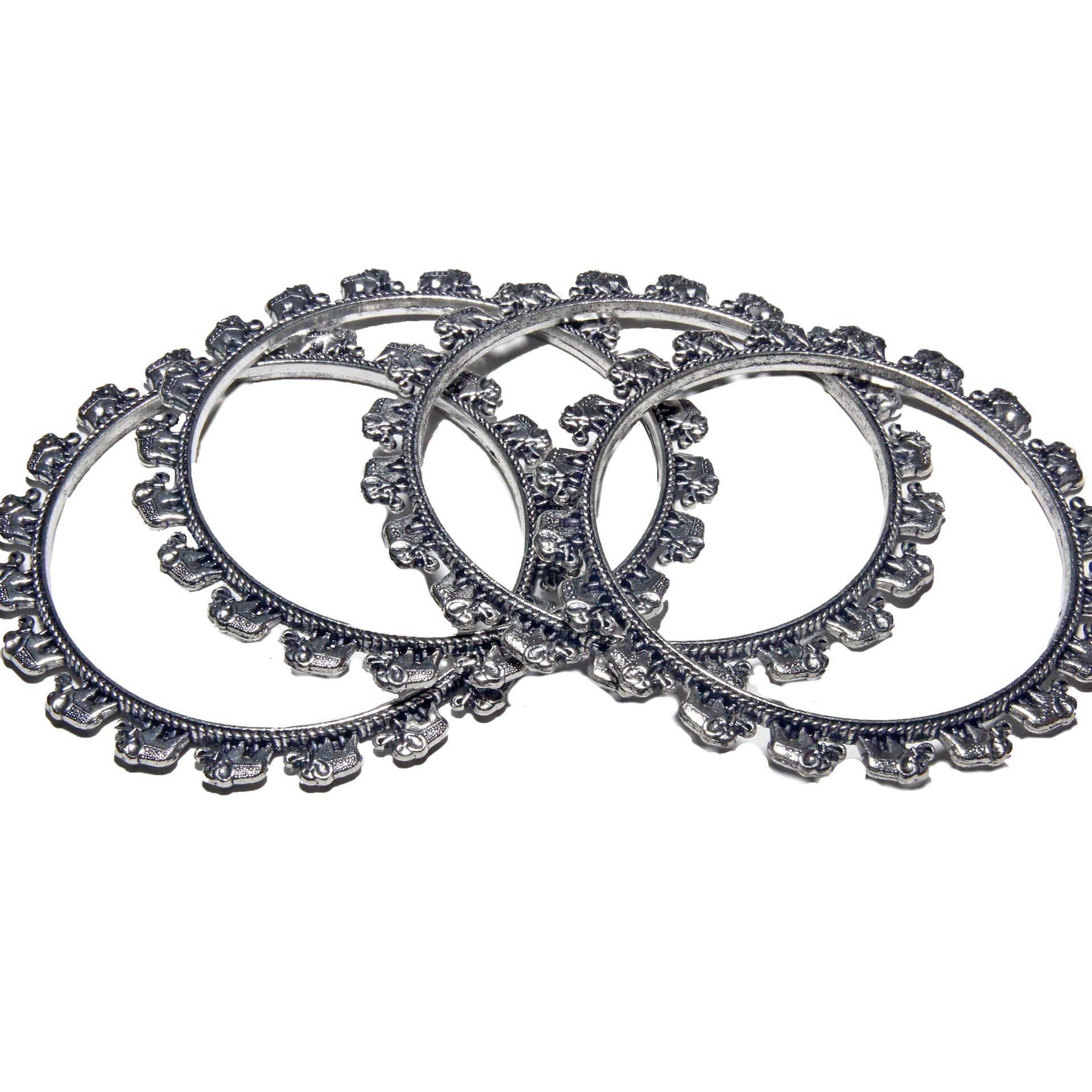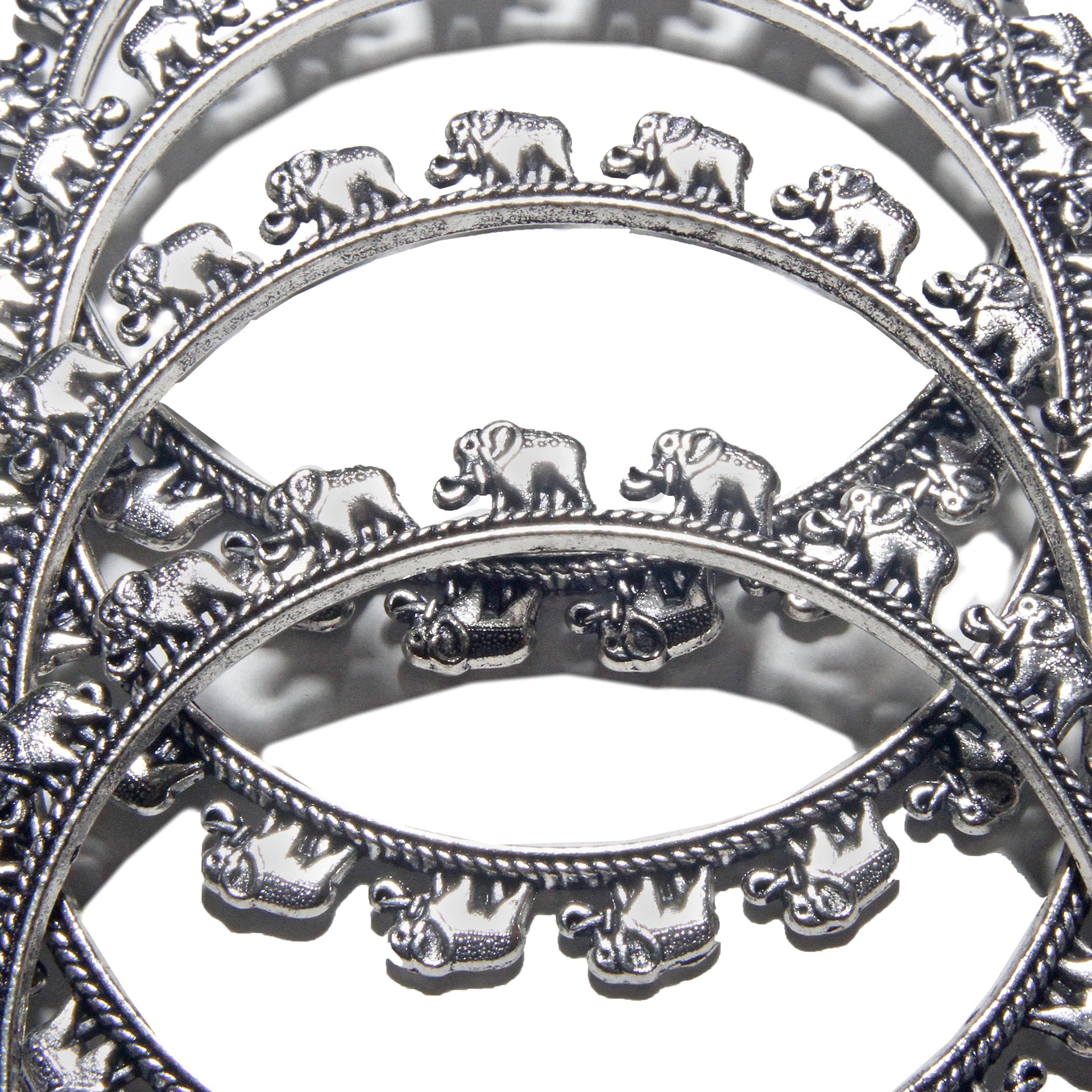 A set of oxidized silver bangles adorned with a parade of miniature elephants — a timeless motif of strength and good fortune. Their antique finish and intricate detailing make them a charming blend of tradition and everyday elegance.