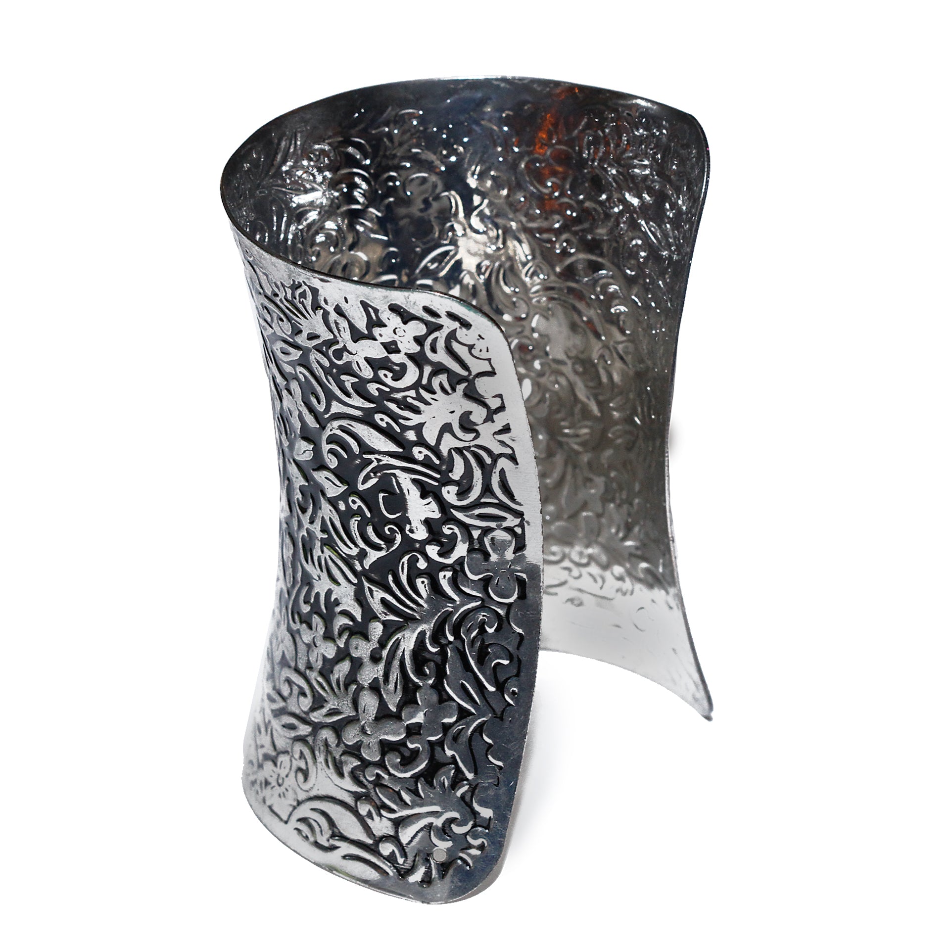 A bold oxidized silver cuff with intricate embossed patterns and curved edges. Effortlessly stylish — it brings a touch of bohemian elegance to both casual and festive looks.