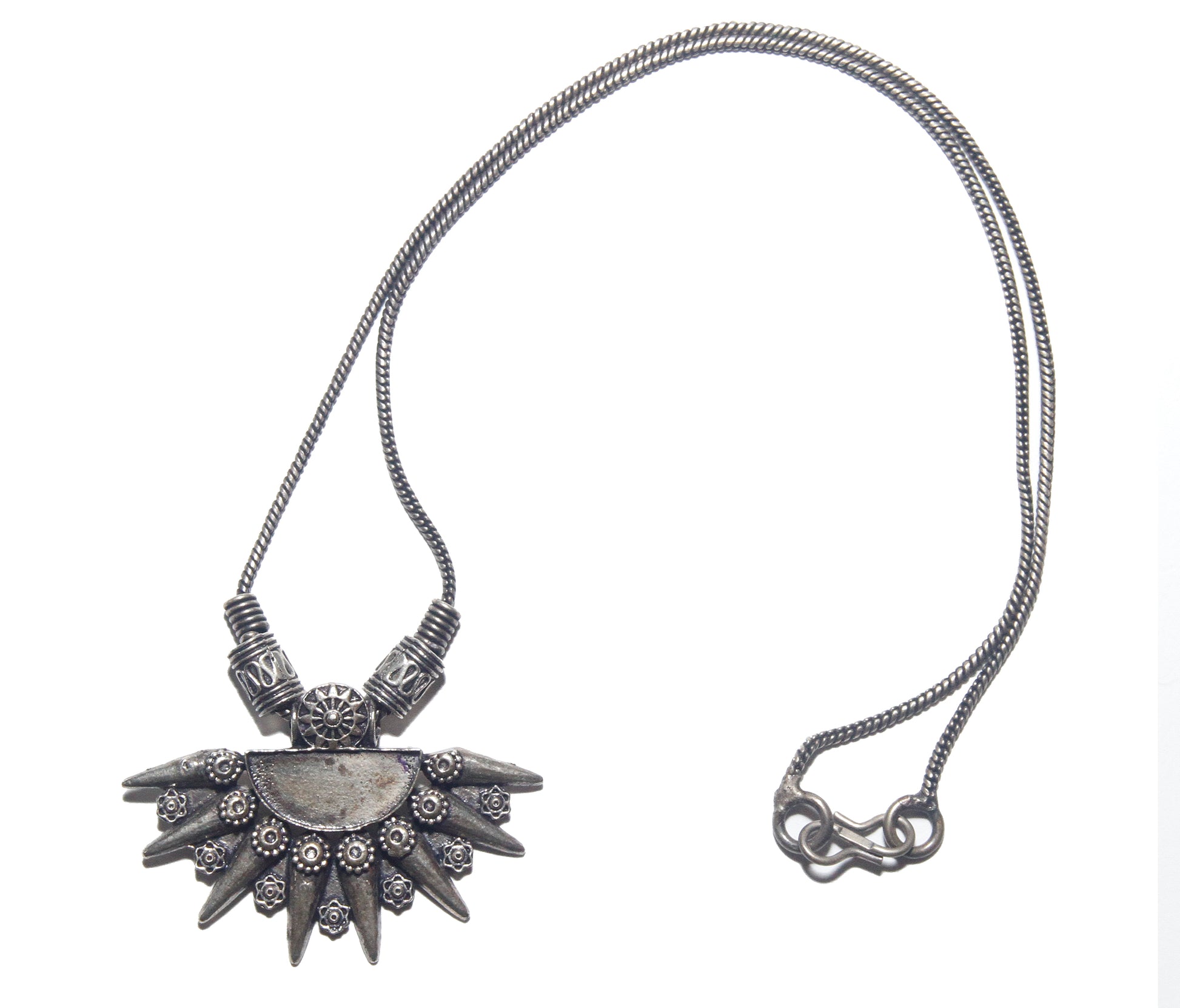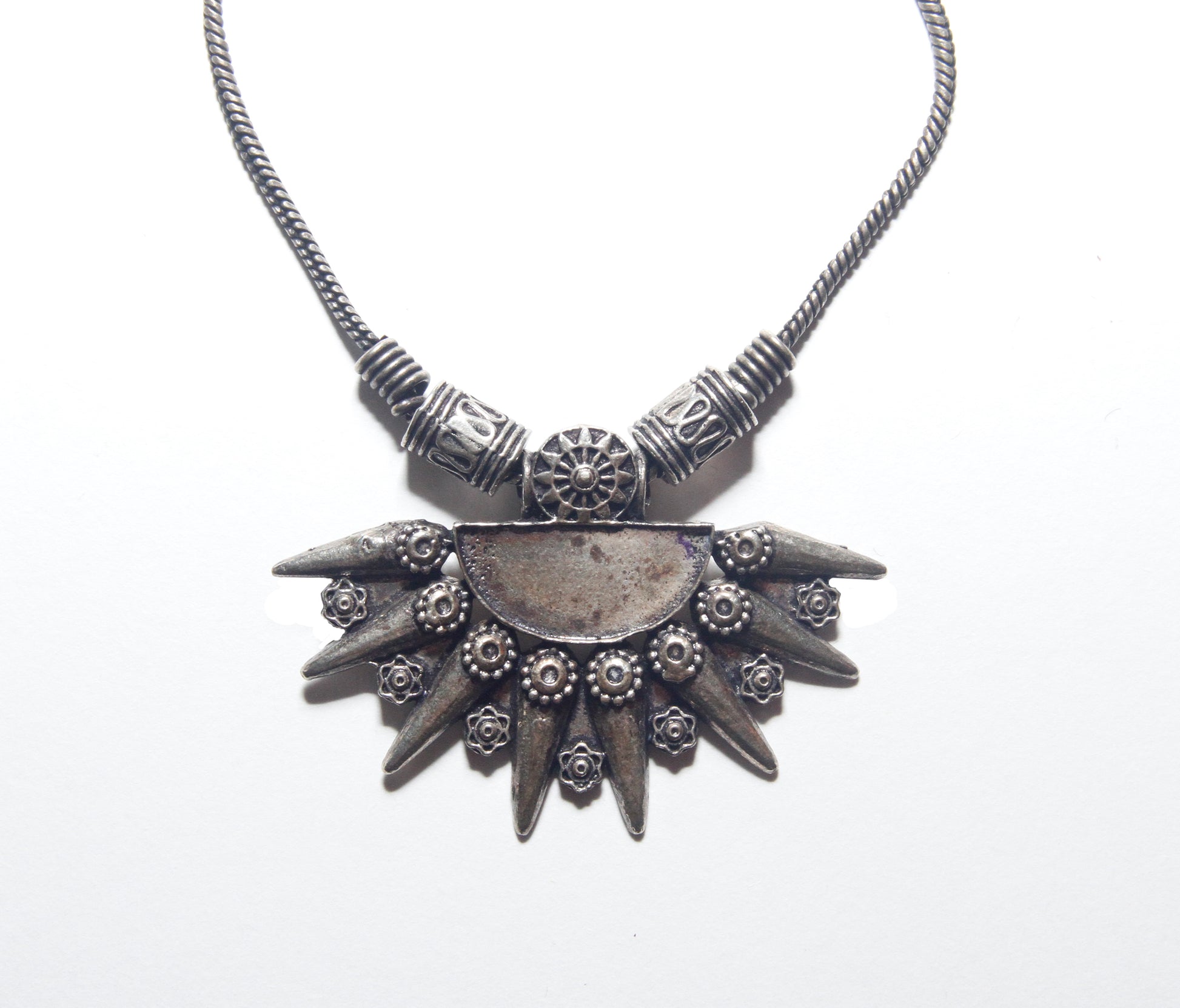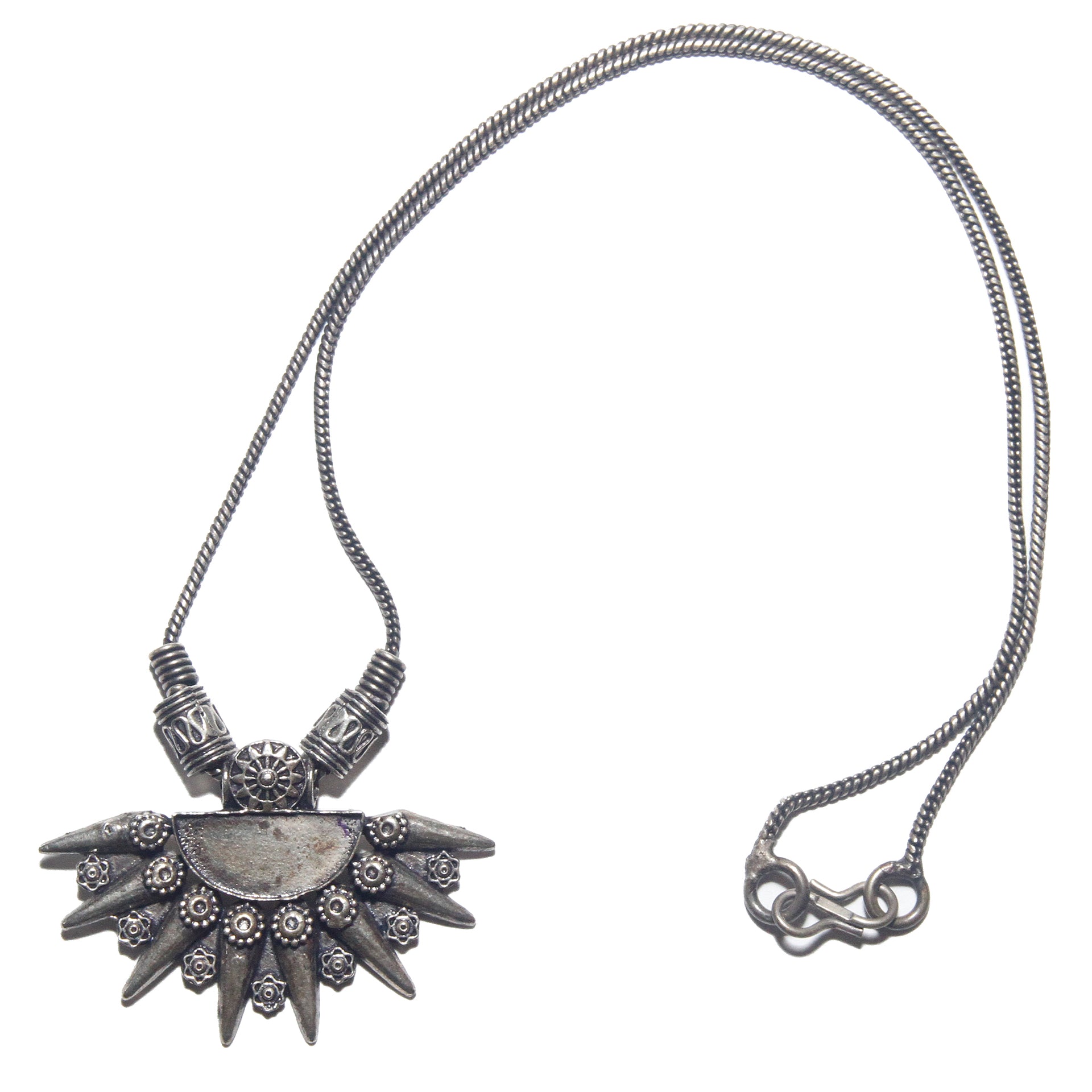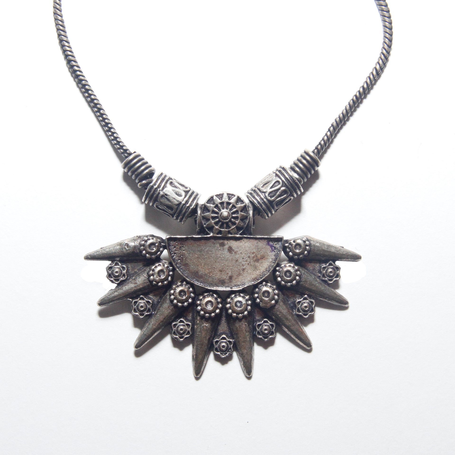 A striking oxidized silver necklace inspired by the rays of the sun — bold yet timeless. Its detailed craftsmanship and antique finish make it the perfect accent for both festive and everyday looks.
