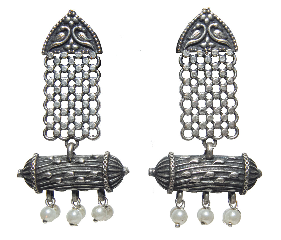 Handrcrafted antique finish earrings with pearl detailing, Traditional deisgn with a geometric modern design element to make it work with both traditional and contemporary look